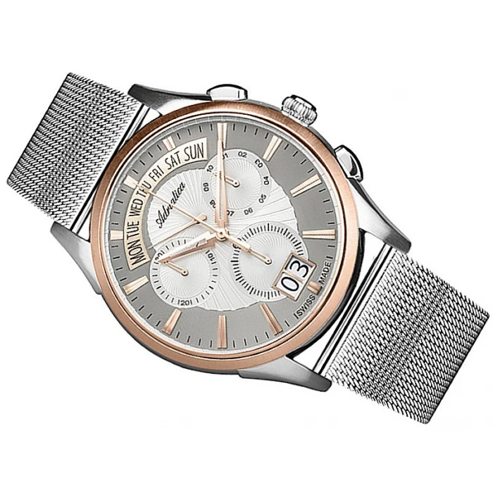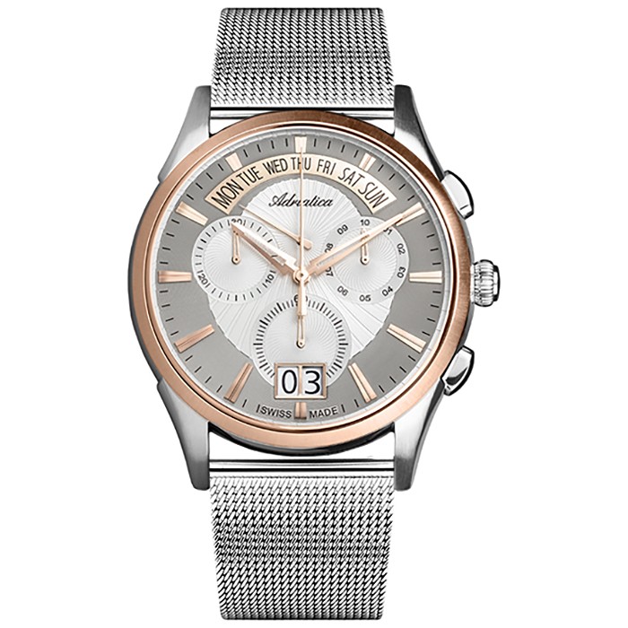 Zegarek ADRIATICA A1193.R113CH to szalenie elegancki i unikatowy model, który jest odpowiedzią dla wszystkich panów lubiących otaczać się dodatkami najwyższej klasy. Koperta w kolorze różowego złota wspólnie z bransoletą typu mesh zostały wykonane z nierdzewnej i antyalergicznej stali szlachetnej. Cyferblat został zaprojektowany w dwóch kolorach srebra i umieszczono na nim 3 dodatkowe subtarcze, datownik dni tygodnia i miesiąca oraz chronograf. W miejscu godzin znajdują się złote indeksy, a aktualny czas pokazują wskazówki w tym samym kolorze. Za bezbłędną i bezawaryjną pracę zegarka ADRIATICA A1193.R113CH odpowiada kwarcowy mechanizm Ronda 8040 Swiss Made. Tarczę zabezpiecza szkiełko szafirowe odporne na różnorodne zarysowania i stłuczenia, a wodoszczelność tego modelu jest na poziomie 5 ATM, czyli 50 metrów (drobne zachlapania powstałe podczas mycia dłoni).