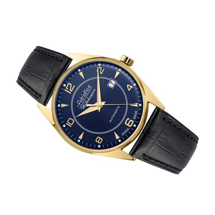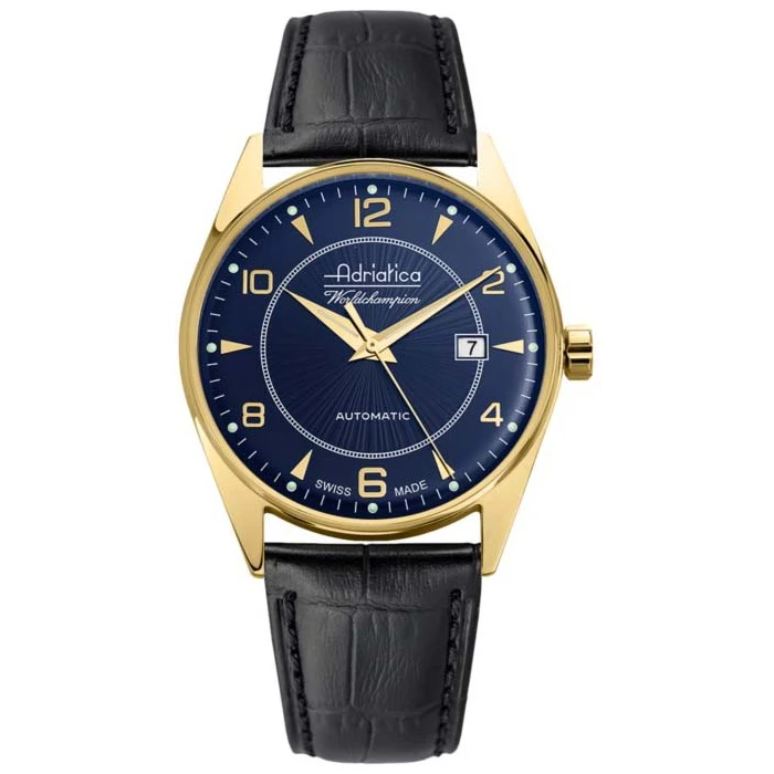 Zegarek ADRIATICA A8142.1255A Worldchampion Automatic to wyjątkowy egzemplarz, który przyciąga uwagę eleganckich mężczyzn. Ma on granatowy cyferblat z datownikiem, który przykrywa szkiełko mineralne, chroniące go przed uszkodzeniami. Koperta pokryta PVD w kolorze złota wykonana jest ze stali szlachetnej, czyli niezwykle trwałego materiału. Całość zawieszono na czarnym, skórzanym pasku o ciekawej fakturze, który wygodnie oplata męski nadgarstek. Urządzenie napędzane jest przez niezawodny mechanizm automatyczny Eta 2824. Jego wodoszczelność plasuje się na poziomie 5 ATM (50 metrów), dzięki czemu wykazuje on odporność na deszcz, pot i krople wody (można myć z nim ręce).