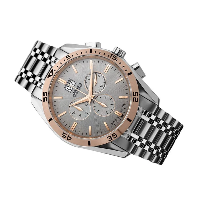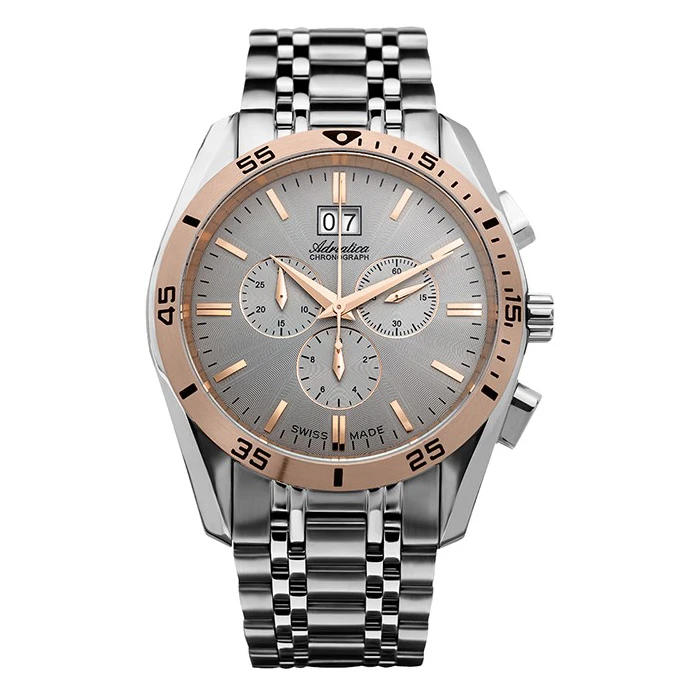Zegarek ADRIATICA A8202.R117CH to absolutny faworyt spośród męskich czasomierzy najlepszej klasy. Obok takiego modelu nikt nie przejdzie obojętnie. Jest on utrzymany w klasycznym kolorze srebra z subtelnymi dodatkami w odcieniu modnego, różowego złota. Wyjątkowa tarcza wzbogacona jest o niezbędne datowniki, dzięki którym w każdym momencie dowiesz się, jaki jest dzień miesiąca i tygodnia. Co więcej, urządzenie wyposażono także w dokładny stoper, czyli chronograf. Zegarek ADRIATICA A8202.R117CH stanie się prawdziwym ulubieńcem miłośników sportu, ponieważ jego wodoszczelność wynosi aż 10 ATM, co oznacza, że można z nim pływać oraz zamaczać go w wodzie. Solidna bransoleta oraz koperta wykonane są ze stali szlachetnej, a szkiełko szafirowe wykazuje doskonałą odporność na zarysowania.