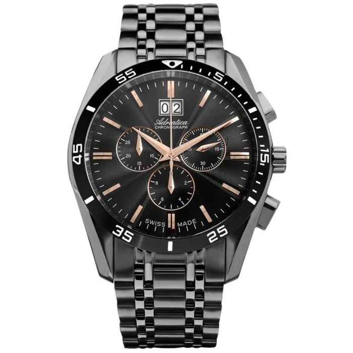 Zegarek męski Adriatica  A8202.S1R6CH w przyciągającej wzrok czarnej kolorystyce z elementami rose gold dla mężczyzn wymagających i pewnych siebie. Model wyposażony został w niezawodny, szwajcarski mechanizm kwarcowy Ronda 5040 zasilany baterią. Zarówno koperta jak i bransoleta wykonane zostały ze stali szlachetnej 316l zapewniającej wysoką jakość i trwałość oraz odporność na czynniki zewnętrzne, takie jak woda czy pot. Tarczę pokryto szkiełkiem szafirowym, które zapewnia optyczną przejrzystość (najlepszą wśród stosowanych szkiełek w zegarkach), jest bardzo trudne do zarysowania a także odporne na różnice temperatur i działanie rozpuszczalników.