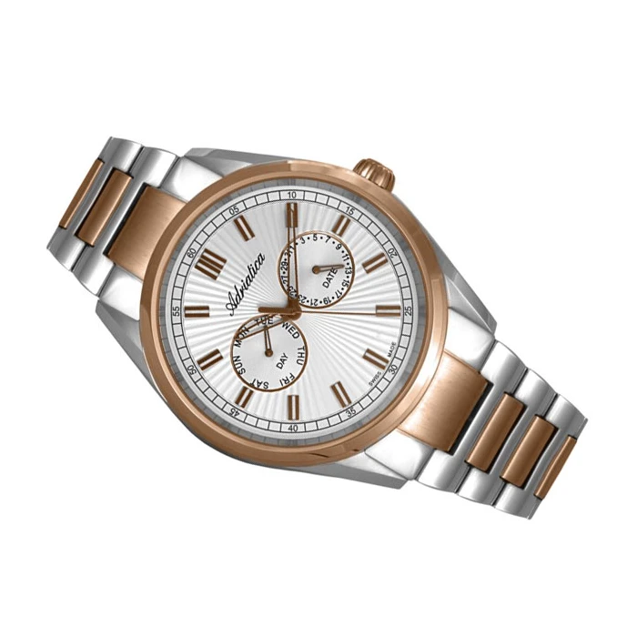 Zegarek ADRIATICA A8211.R113QF to jedna z najciekawszych propozycji od tego Szwajcarskiego producenta. Został on zaprojektowany i wykonany z myślą o mężczyznach, którzy poszukują czasomierza idealnego na każdą okazję. Genialnie prezentuje się on na męskim nadgarstku. Wyróżnia się spośród innych czasomierzy dzięki ciekawie zaprojektowanej tarczy, na której znalazły się dwa datowniki. Cyferblat przykrywa szkiełko utwardzane, które charakteryzuje się wysoką odpornością na stłuczenia. Bransoleta oraz koperta wykonane ze stali szlachetnej wykończone są w stylu bicolor (odcień różowego złota oraz srebra). Zegarek ADRIATICA A8211.R113QF napędzany jest dzięki najlepszej klasy mechanizmowi Ronda 706.