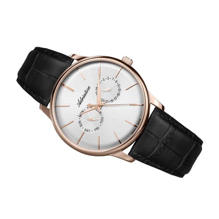 Zegarek ADRIATICA A8243.9213QF to model dla mężczyzn, którzy doceniają klasyczne rozwiązania. Wyróżnia się on dzięki czytelnej, jasnej tarczy, na której producent umieścił dwa datowniki. Nosząc ten model na co dzień, nie musisz martwić się o uszkodzenia, ponieważ cyferblat przykrywa wysokiej jakości szkiełko mineralne. Sercem urządzenia jest mechanizm Ronda 706 Swiss Made. Dodatkową zaletą czasomierza od firmy ADRIATICA jest wodoszczelność, która wynosi 5 ATM. Dzięki temu możesz swobodnie dbać o higienę dłoni, nie martwiąc się o zachlapania. Z zegarkiem nie należy jednak pływać. Model ten utrzymany jest na czarnym, skórzanym pasku, który dostojnie prezentuje się na męskim nadgarstku. Okrągła koperta w złotym kolorze wykonana jest z nierdzewnej stali szlachetnej.