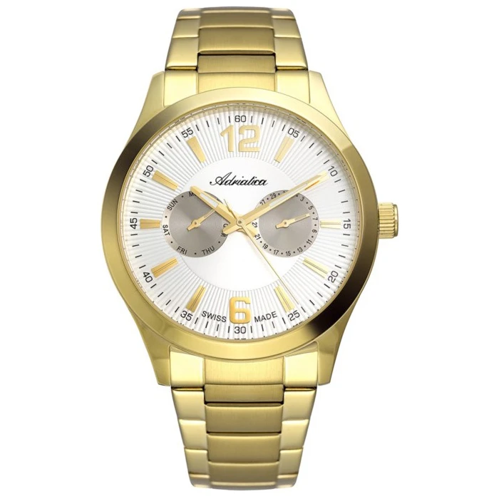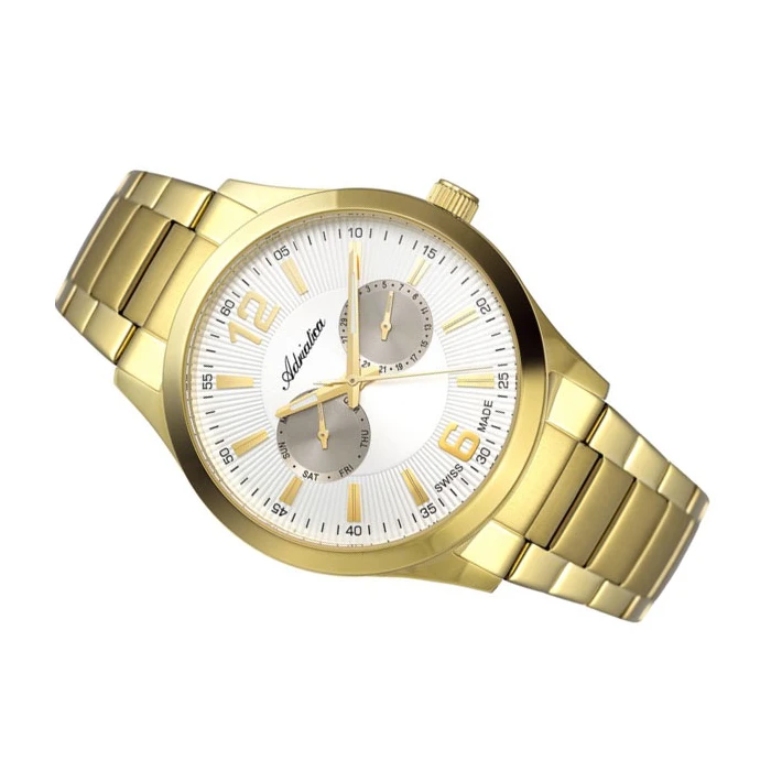 Zegarek ADRIATICA A8257.1153QF to ekskluzywny model, obok którego żaden mężczyzna nie przejdzie obojętnie. Producent wyposażył go w mechanizm Ronda 706, który zapewnia bezawaryjne działanie. Produkt wykonano z bezpiecznej dla skóry stali szlachetnej, którą pokryto PVD w kolorze luksusowego, prawdziwego złota. Trójrzędowa bransoleta zwieńczona jest niezawodnym zapięciem. Na jasnej tarczy znajdują się dwie subtarcze oraz złote indeksy. Całość szczelnie ochrania szafirowe szkło, cechujące się doskonałym poziomem odporności na zarysowania oraz nienaganną przejrzystością. Do zalet tego czasomierza należy zaliczyć także jego wodoszczelność, która zgodnie z deklaracją producenta wynosi 5 ATM (50 metrów), co oznacza, że można myć z nim ręce. Szwajcarski zegarek ADRIATICA A8257.1153QF waży 114 g, dzięki czemu wygodnie leży na męskim nadgarstku.