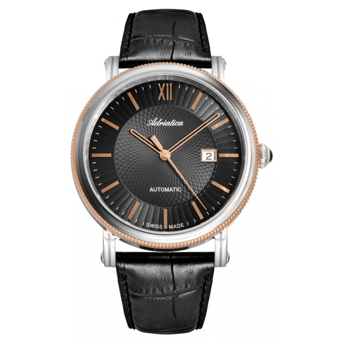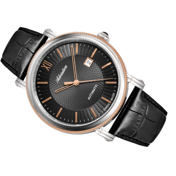 Zegarek ADRIATICA A8272.R264A to męski model w uniwersalnej czarnej kolorystyce. Wyróżniającą się okrągłą kopertę wykończono w kolorze srebra z dodatkiem modnego różowego złota. Do jej produkcji użyto trwałej i nierdzewnej stali szlachetnej. Skórzany pasek wygodnie leży na nadgarstku. Cyferblat pokryto odpornym na zarysowania i stłuczenia szkiełkiem szafirowym, od którego w skali Mohsa twardszy jest jedynie diament. Na tarczy obok godziny 3 zlokalizowano datownik dni miesiąca, dzięki czemu w każdej chwili możemy sprawdzić aktualną datę bez konieczności sięgania po telefon lub kalendarz. Zegarek ADRIATICA A8272.R264A napędza automatyczny mechanizm Sellita SW200/Eta 2824 Swiss Made. Jednostka tego typu działa dzięki ruchom ręki. Warto również zwrócić uwagę na wodoszczelność tego produktu, która wynosi 5 ATM i pozwala na delikatne zachlapania np. krople wody, deszcz lub pot.