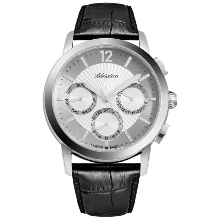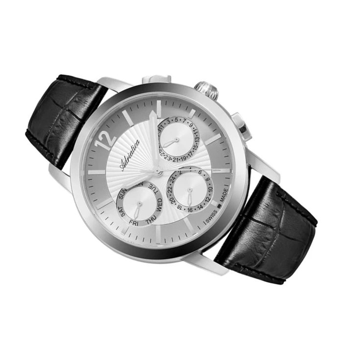 Zegarek ADRIATICA A8273.5253QF to synonim prawdziwej elegancji, połączonej z nowoczesnym designem. Model ten dedykowany jest dla osób, poszukujących czasomierza idealnego zarówno do garnituru, jak i na co dzień. Czasomierz wyposażono w jasną tarczę o srebrnym odcieniu. Znalazły się na niej trzy datowniki, dzięki którym na cyferblacie możesz sprawdzić nie tylko aktualną godzinę, ale także dzień tygodnia i miesiąca. Zegarek ADRIATICA A8273.5253QF zabezpieczony jest przed zarysowaniami dzięki szafirowemu szkiełku o doskonałej przejrzystości. Urządzenie zawieszono na skórzanym, czarnym pasku, który wygodnie leży na męskim nadgarstku. Mechanizm Isa 9239 odpowiada za sprawne działanie zegarka. Klasa wodoszczelności wynosi 5 ATM, czyli 50 metrów. Dzięki temu nie musisz martwić się o drobne zachlapania, np. podczas mycia rąk.