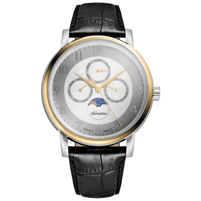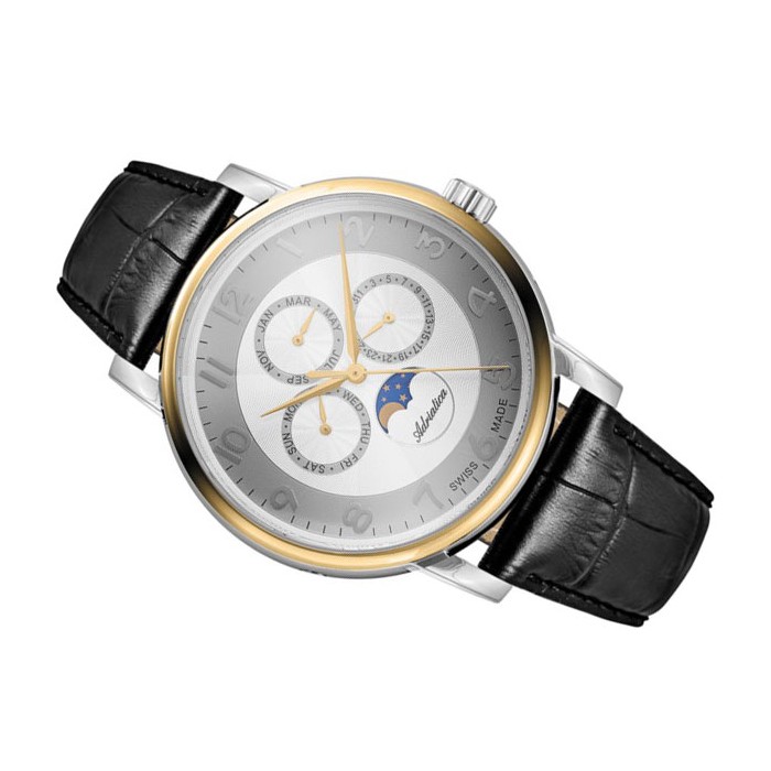 To multifunkcyjny model, wyróżniający się niepospolitym designem oraz doskonałymi parametrami technicznymi. Przyciągająca uwagę tarcza, wyposażona w aż trzy datowniki i modny wskaźnik faz księżyca przykryta jest nierysującym się, szafirowym szkłem. Solidna koperta ze stali szlachetnej zapewnia skuteczną ochronę kwarcowego mechanizmu Ronda 706 przed stłuczeniami. Za komfort noszenia zegarka na co dzień odpowiedzialny jest przyjemny w dotyku, skórzany pasek o tradycyjnej, czarnej barwie. Klasa wodoszczelności tego czasomierza pozwala na sporadyczny kontakt z wodą (5 ATM).