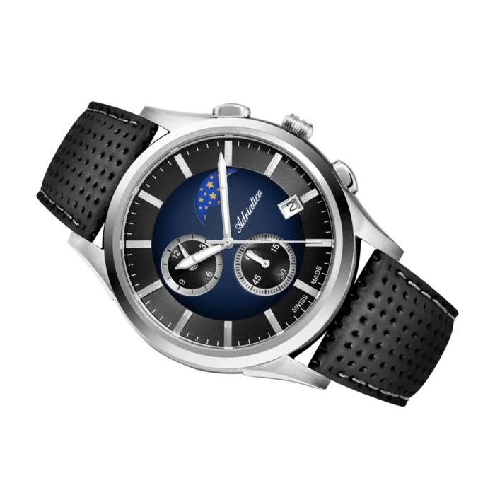 Zegarek ADRIATICA A8282.5215CH to model, który z pewnością przypadnie do gustu fanom dobrego stylu i wszystkim mężczyznom, chcącym urozmaicić swoją garderobę o wyjątkowy dodatek, charakteryzujący się wysoką jakością wykonania. Czasomierz utrzymany jest w czarnogranatowym kolorze z domieszką wyróżniającego się, srebrnego odcienia. W centralnym punkcie zegarka, czyli na cyferblacie, znajdują się dodatkowe subtarcze, pełniące funkcje chronografu, wskaźnika faz księżyca oraz datownika. Całość przykrywa szkiełko szafirowe o doskonałej odporności na zarysowania. Zegarek ADRIATICA A8282.5215CH ma wodoszczelność na poziomie 5 ATM, czyli 50 metrów. Oznacza to, że czasomierz wykazuje odporność na drobne zachlapania i sporadyczny kontakt z kroplami wody. Za niezawodne działanie urządzenia odpowiada mechanizm Eta G10.