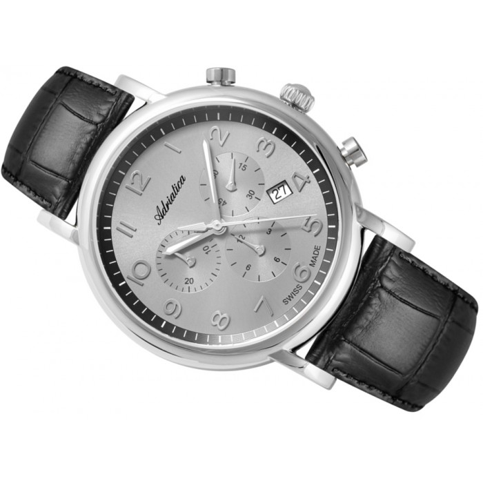 Zegarek ADRIATICA A8297.5227CH to ciekawy i elegancki model na każdą okazję. Czarny, skórzany pasek razem ze srebrną kopertą w zestawieniu z szarą tarczą tworzą niezwykłe połączenie. Czasomierz wyposażono w datownik dni miesiąca oraz chronograf. Szwajcarki mechanizm umieszczony w tym modelu to kwarcowa jednostka Ronda 5030 Swiss Made, która daje gwarancje chodu i precyzyjności. Warto również wspomnieć, że cyferblat zabezpieczony jest szkłem szafirowym odpornym na wszelkie zarysowania i stłuczenia. Producent postarał się także w kwestii wodoszczelności zegarka ADRIATICA A8297.5227CH, która wynosi 5 ATM, czyli 50 metrów, co pozwala na delikatne czy przypadkowe zachlapania wodą.
