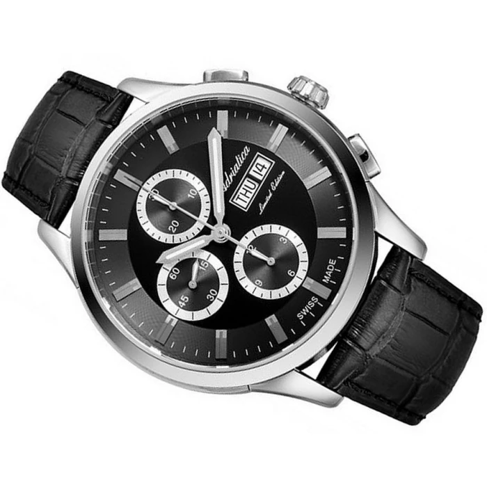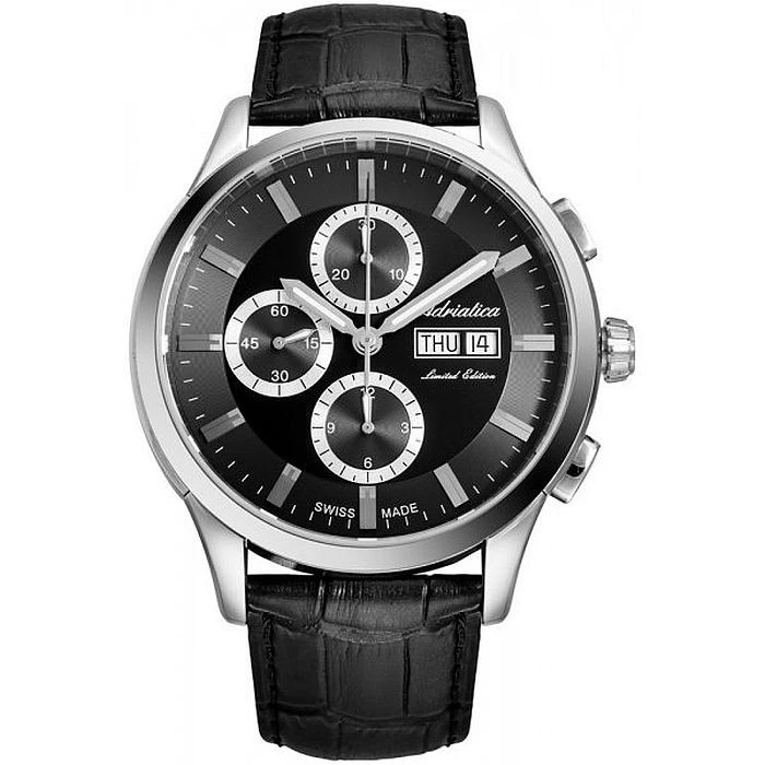 Zegarek Adriatica A1992.5214A  to męski czasomierz automatyczny napedzany precyzyjnym mechanizmem ETA 7750 Valjoux. Na czarnej tarczy precyzyjnie czas odmierzają srebrne wskazówki pokryte warstwą fluorescencyjną. Na godzinie trzeciej umieszczony został datownik pokazujący aktualny dzień tygodnia i miesiąca.