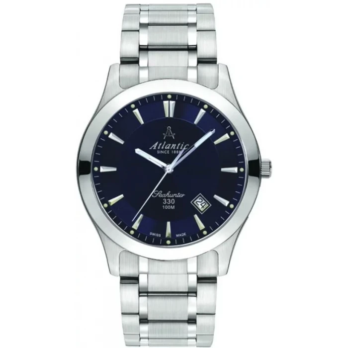 Atlantic Seahunter 71365.41.51 to męski, szwajcarski zegarek wyposażony w mechanizm kwarcowy - RONDA 715. Klasyczną, granatową tarczę pokrywa szkiełko szafirowe. Zapewnia ono optyczną przejrzystość (najlepszą wśród stosowanych szkiełek w zegarkach), jest bardzo trudne do zarysowania a także odporne na różnice temperatur i działanie rozpuszczalników. Zarówno koperta jak i bransoleta wykonane zostały ze stali szlachetnej 316L, trwałej i odpornej na czynniki zewnętrzne. Wodoszczelność na poziomie 10 ATM pozwala na swobodne pływanie. Dodatkowym atutem jest praktyczny datownik wskazujący aktualny dzień miesiąca.