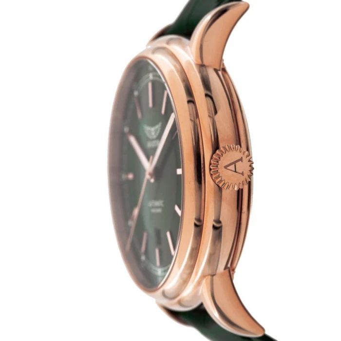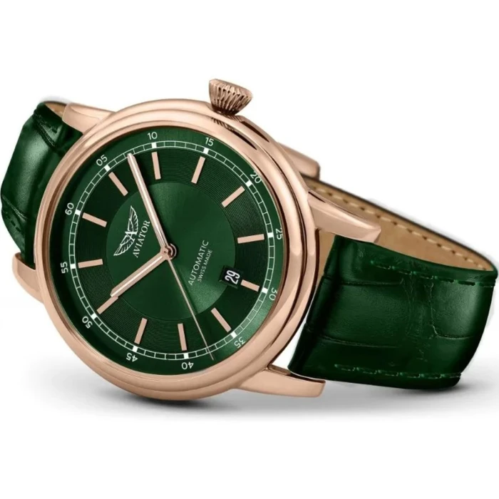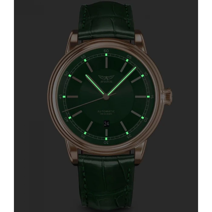 AVIATOR V.3.32.2.237.4 to elegancki model inspirowany legendarnym samolotem pasażerskim Douglas DC-3, napędzany za pomocą precyzyjnego, szwajcarskiego mechanizmu automatycznego Sellita SW200, osadzonego na 26 kamieniach łożyskujących gdzie rezerwa chodu wynosi około 38 godzin. Koperta o obłych bokach wykonana została z hipoalergicznej, odpornej na warunki atmosferyczne oraz korozję stali szlachetnej, pokrytej powłoką PVD w modnym kolorze różowego złota. Elementem przykuwającym wzrok jest zielona tarcza. Na jej krawędzi umieszczono skalę minutową w formie torowiska. Giloszowany pierścień z nakładanymi podłużnymi, indeksami godzinowymi w różowym złoceniu umieszczono tuż pod skalą minutową. Centralna część natomiast ozdobiona została szlifem słonecznym, który w zależności od kąta padania światła tworzy ciekawe efekty wizualne. Całość zabezpieczono lekko wypukłym, anty-refleksyjnym szkiełkiem szafirowym, które dzięki swojej twardości doskonale chroni cyferblat.