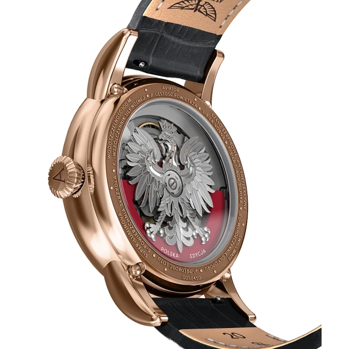 Jednak najbardziej imponującym elementem zegarka jest rotor mechanizmu, zachowany w kształcie naszego godła narodowego - Orła Białego. To pierwsze i jak dotąd jedyne takie rozwiązanie na świecie! Takiego wahnika nie znajdziemy w żadnym innym zegarku, czyniąc tę kolekcję całkowicie wyjątkową i niepowtarzalną.