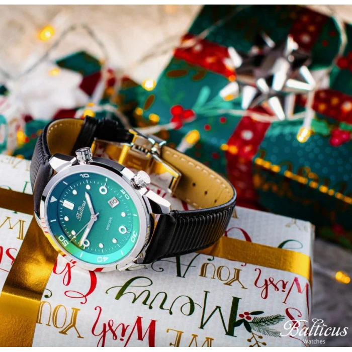 Zegarek Balticus Grey Seal BLT-BALGSGRN w kolorze zielony gradient - to najnowsza odsłona kultowej kolekcji zegarków Balticus Grey Seal. Ten model został wyposażony w kopertę ze stali szlachetnej o średnicy 44 mm. Tarcza zegarka została schowana pod szafirowym szkiełkiem. Pod szkiełkiem znajdziemy obrotowy bezel regulowany specjalnie przystosowaną do tego koronką. Tarcza w kolorze zielonego gradientu przykuwa uwagę intensywnym kolorem oraz ciekawymi skrajnymi indeksami . Zarówno znaczniki godzinowe, jak i wskazówki pokryte zostały grubą warstwą farby luminescencyjnej. Zastosowana luma zapewnia długie godziny świecenia i łatwość odczytu godziny, nawet w całkowitej ciemności. Czasomierz został wyposażony w sekundnik oraz czytelny datownik znajdujący się na godzinie "4".