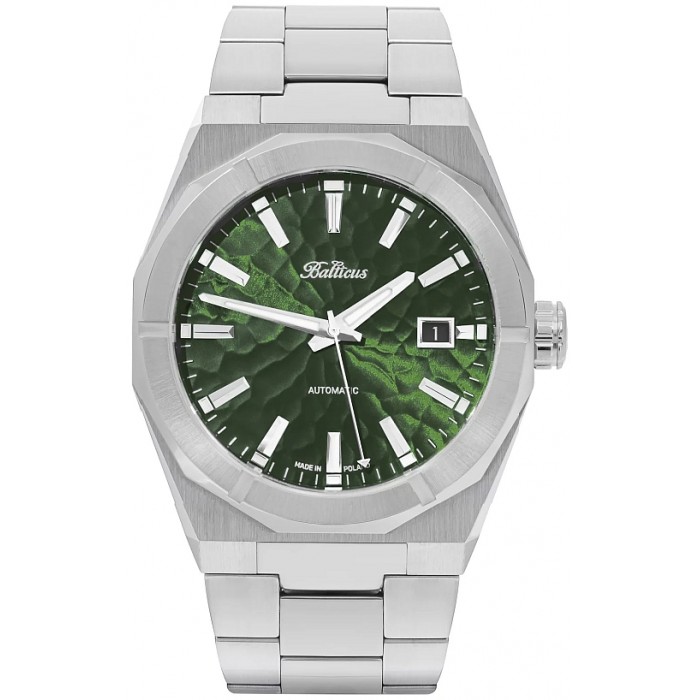 BALTICUS BALSDGHD to luksusowy czasomierz polskiej marki, wyposażony w zaawansowany mechanizm automatyczny Citizen Miyota 9015 24 klejnoty, gdzie rezerwa chodu wynosi 42 godziny. Koperta zbudowana z ośmiokątnej podstawy została wykonana z hipoalergicznej, odpornej na zarysowania oraz korozję stali szlachetnej w kolorze srebrnym. Dynamiki dodaje dwunastoboczna luneta przyozdobiona drobnymi wycięciami. Całość zawieszona została na regulowanej bransolecie również w srebrnej barwie. Zapięcie motylkowe zastosowane w tym modelu, umożliwia szybkie zakładanie i zdejmowanie zegarka, przy czym konstrukcja nie pozwala na samoistne odpinanie bransolety. Cechą wyróżniającą czasomierz jest tarcza w zielonym kolorze, zwraca na siebie uwagę za sprawą ozdobnego wykończenia w postaci tzw. efektu młotkowania. Przypomina rzeźbioną uderzeniami młotka powierzchnie, dając efekt charakterystycznej falistej faktury. W zależności od kąta padania światła kolor nieco się zmienia, tworząc ciekawe efekty wizualne. Czasomierz zabezpieczono anty-refleksyjnym szkiełkiem szafirowym, które dzięki swojej twardości doskonale chroni cyferblat zegarka przed zarysowaniem oraz zapewnia czytelność przy mocnym natężeniu światła czy w słoneczne dni.