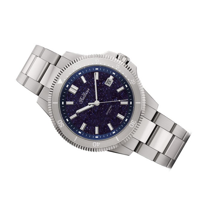 Zegarek BALTICUS MOONFISH BTMFBA to luksusowa propozycja typu diver, która przeznaczona jest dla mężczyzn. Za projektem tego czasomierza stoi polski projektant, Mateusz Przystał. Urządzenie od marki Balticus wykonano z wysokogatunkowej stali 904L, która zapewnia efekt lustrzanej powierzchni. Tarcza z motywem gwiezdnego pyłu z technologią SuperLuminova o gradacji X1 i nakładanymi indeksami, przykryta jest przez antyrefleksyjne i odporne na zarysowania szkiełko szafirowe. Zegarek BALTICUS MOONFISH BTMFBA zapewnia najwyższy komfort użytkowania, dzięki wodoszczelności na poziomie 20 ATM. Produkt wyposażono także w obrotowy bezel, zakręcaną koronkę i zakręcany dekiel. Z czasomierzem na nadgarstku można więc pływać i nurkować bez przeszkód. Urządzenie napędzane jest przez automatyczny mechanizm Miyota 9015.
