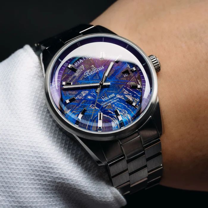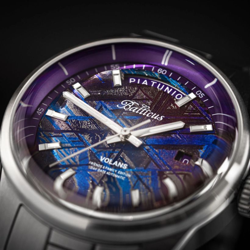 Balticus Piątunio to symfonia elegancji i kosmicznej tajemnicy, gdzie każdy detal budzi podziw. Tarcza z podgrzanego meteorytu w głębokich odcieniach fioletu i błękitu mieni się naturalnymi wzorami – geometrycznymi liniami, które powstały miliony lat temu w sercu gwiazd. To nie syntetyka, to autentyczny fragment kosmosu, który zmienia kolor w zależności od światła: raz głęboki granat nocnego nieba, raz elektryzujący fiolet zorzy polarnej. Polerowana koperta ze stali nierdzewnej o średnicy 41 mm podkreśla futurystyczny kształt, a bransoleta ze stali nierdzewnej posiada tę samą szerokość na całej swojej długości. Jej poszczególne ogniwa zostały zmniejszone do wysokości 3mm. Dzięki temu jest ona bardzo zwiewna, a jednocześnie niezwykle solidna.