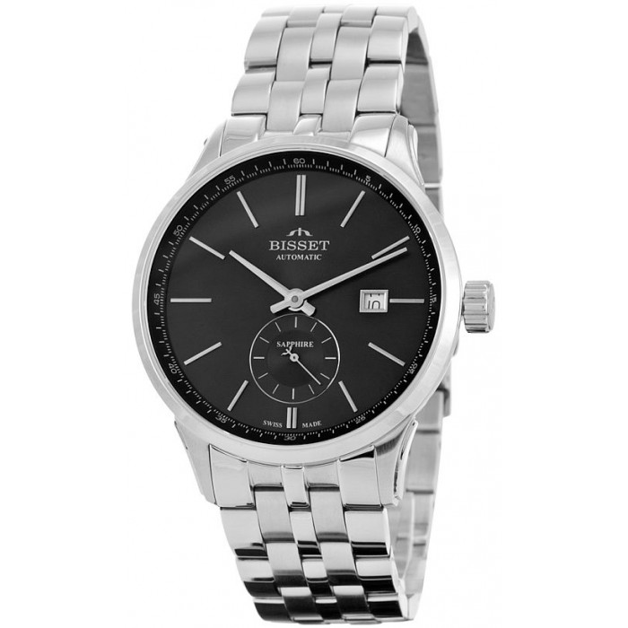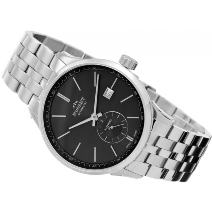Zegarek męski Bisset BSMF59 Swiss Made to model z kolekcji Classic Automatic Premium, którego napędza ceniony, szwajcarski mechanizm Sellita SW260-1 z automatycznym naciągiem łożyskowanym na 31 kamieniach i rezerwą chodu do 41h. Ponadto mechanizm ten ma możliwość ręcznego dociągu oraz posiada funkcję stop sekundy. Charakterystyczne są datownik oraz funkcja małej sekundy.