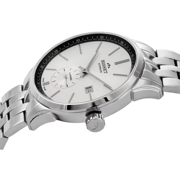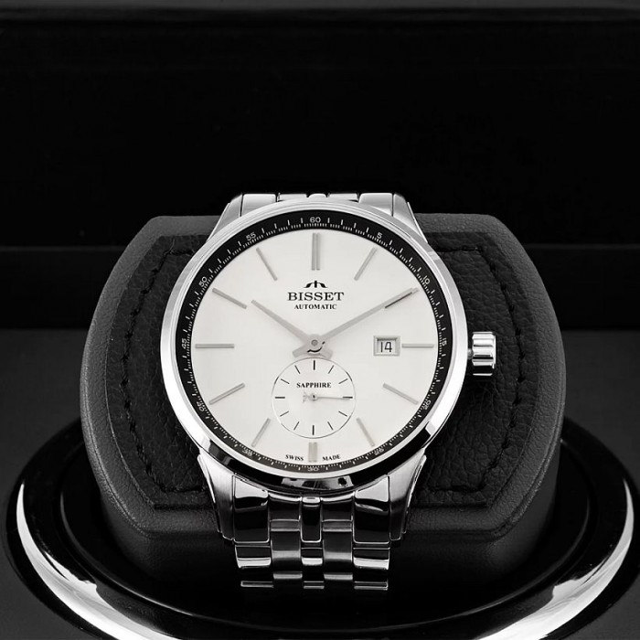 Zegarek męski Bisset BSMF59 Swiss Made to model z kolekcji Classic Automatic Premium, którego napędza ceniony, szwajcarski mechanizm Sellita SW260-1 z automatycznym naciągiem łożyskowanym na 31 kamieniach i rezerwą chodu do 41h. Ponadto mechanizm ten ma możliwość ręcznego dociągu oraz posiada funkcję stop sekundy. Charakterystyczne są datownik oraz funkcja małej sekundy.
