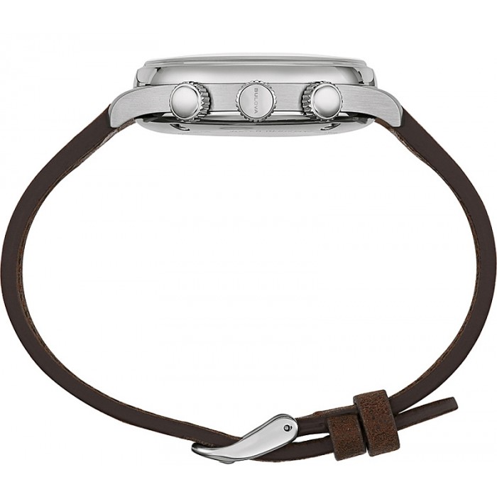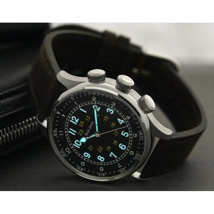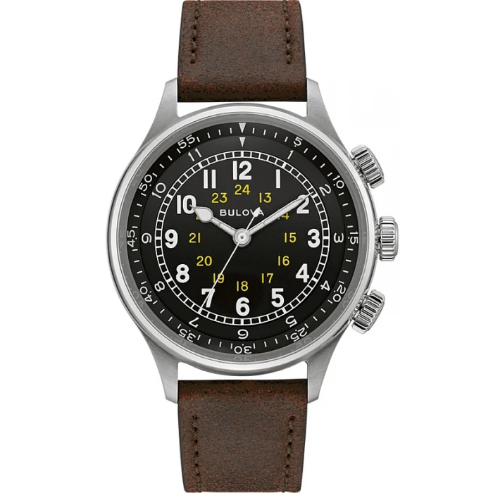 Zegarek BULOVA 96A245 posiada szczelność pozwalającą jedynie na drobne zachlapania WR-30m chociaż polerowany, stalowy dekiel zakręcany jest 4-ma śrubami dokładnie tak, jak wyglądało to w pierwowzorach. Wyjątkowo atrakcyjny model w dominującej czerni z białymi i żółtymi cyframi uzupełnia solidny pasek o szerokości 20mm wykonany z surowej skóry w brązowym odcieniu.