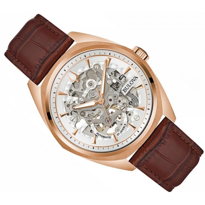 Model BULOVA 97A175 to elegancki, męski zegarek napędzany przez japoński mechanizm MIYOTA 8N26 z automatycznym naciągiem zasilany ruchem ręki. Ten mechanizm osadzony jest na 21 kamieniach i rezerwę mocy do 40 godzin a częstotliwość taktowania wynosi 21600 bph. Koperta prezentowanego modelu wykonana jest ze stali szlachetnej odpornej na korozję złoconej opatentowaną technologią PVD, natomiast pasek wykonano ze skóry naturalnej. Zegarek dzięki tarczy typu skeleton oraz szklanemu dekielkowi daje możliwość obserwowania pracy mechanizmu. Całość tarczy ochrania szkiełko mineralne, bardzo często wykorzystywane przy produkcji zegarków szkiełko mineralne ma piąty stopień twardości w skali Mohsa. Jest bardzo przejrzyste, elastyczne, a w razie zarysowania, można je łatwo wypolerować.