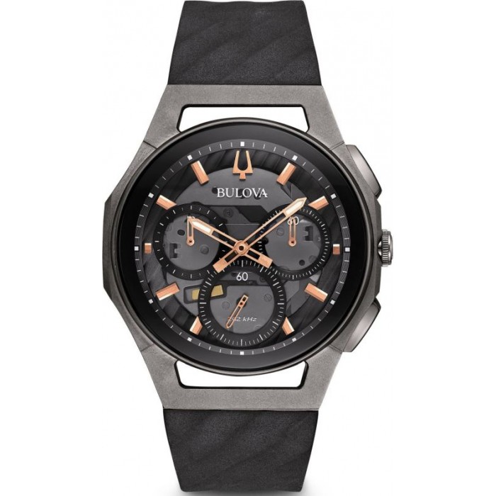 Model BULOVA CURV 98A162 to elegancki, męski zegarek kwarcowy zasilany baterią. Zegarek posiada pierwszą na świecie zakrzywioną kopertę, w której mechanizm porusza się z częstotliwością wibracji 262 KHz, co sprawia iż jest on bardzo precyzyjny . Koperta prezentowanego modelu wykonana jest z tytanu z elementami stali i umocowana na pasku gumowym. Całość tarczy ochrania szkiełko szafirowe które jest odporne na zarysowania. Do pozostałych zalet zegarka możemy zaliczyć przezroczysty dekielek który pozwala na obserwowanie mechanizmu zegarka, niestandardowy design koperty oraz wskazówki pokryte warstwą fosforyzującą.