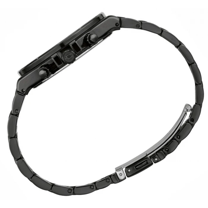 Model BULOVA CHRONOGRAPH 98A242 to męski zegarek sportowy napędzany przez kwarcowy mechanizm zasilany baterią. Zarówno bransoleta jak i koperta prezentowanego modelu wykonane zostały ze stali szlachetnej oksydowanej na kolor czarny. Całość tarczy ochrania szkiełko mineralne, bardzo często wykorzystywane przy produkcji zegarków (szkiełko to ma piąty stopień twardości w skali Mohsa). Jest bardzo przejrzyste, elastyczne, a w razie zarysowania, można je łatwo wypolerować. Do zalet zegarka zaliczymy wskazówki pokryte warstwą fosforyzującą delikatnie świecącą w ciemności.