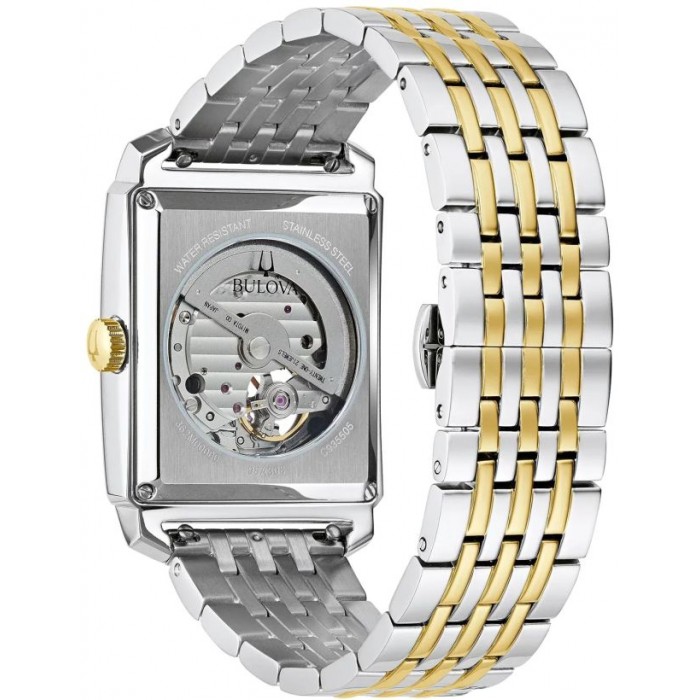 Uwagę zwraca fakturowana tarcza w białym kolorze. Indeksy w formie arabskich cyfr i wskazówki w złotym kolorze doskonale pasują do jasnego tła tarczy. Dodatkową zaletą zegarka BULOVA 98A308 jest tzw. "open heart" umieszczony na cyferblacie oraz przeszklony dekielek z tyłu zegarka dzięki czemu mamy możliwość podglądu pracy mechanizmu.