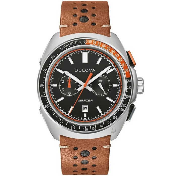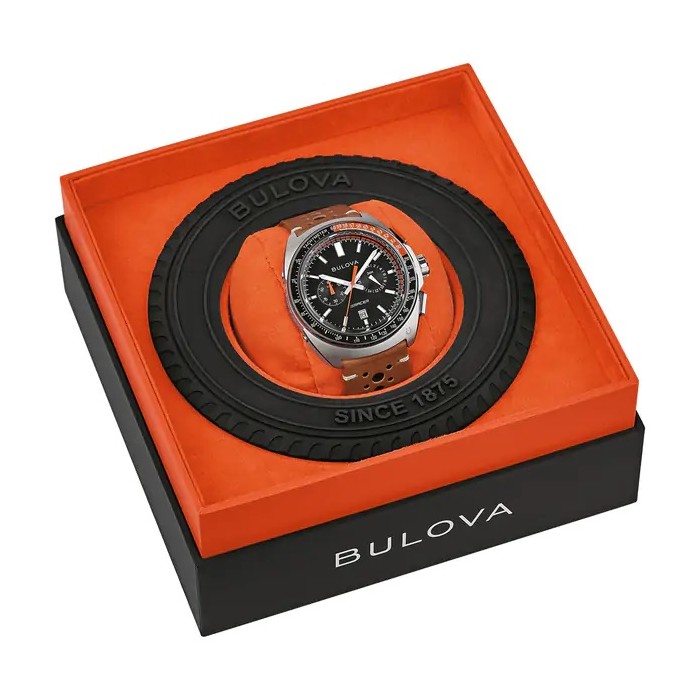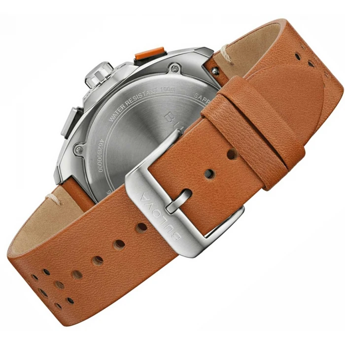 Nowy zegarek Bulova 98B427 z kolekcji sportowej amerykańskiego producenta, poświęconej szczególnie sportom motorowym. Ten nowoczesny chronograf posiada precyzyjny, japoński mechanizm kwarcowy MIYOTA OS21. Koperta, powlekana jonowo w czarnym kolorze wykonana została ze stali szlachetnej 316l która jest odporna na czynniki zewnętrzne. Skórzany, brązowy pasek jest trwały, ma solidna strukturę a przy tym jest wygodny i komfortowy w użytkowaniu.