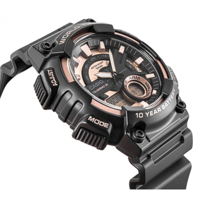 Casio AEQ-110W-1A3 zachwyca sportowym, nowoczesnym wyglądem z nutą elegancji. Czarno-różowozłota tarcza z efektem 3D zapewnia doskonałą czytelność, a koperta z żywicy w czarnym kolorze współgra z czarnym paskiem z żywicy z wygodnym zapięciem na sprzączkę. Waga ok. 49 g i smukła konstrukcja sprawiają, że zegarek wygodnie leży na nadgarstku, pasując do casualowych i sportowych stylizacji. To, co dodatkowo przykuwa uwagę, to hybrydowy wyświetlacz analogowo-cyfrowy, wyświetlacz Telememo oraz subtelne akcenty rose gold na bezelu i indeksach, inspirowane globalnym duchem marki.