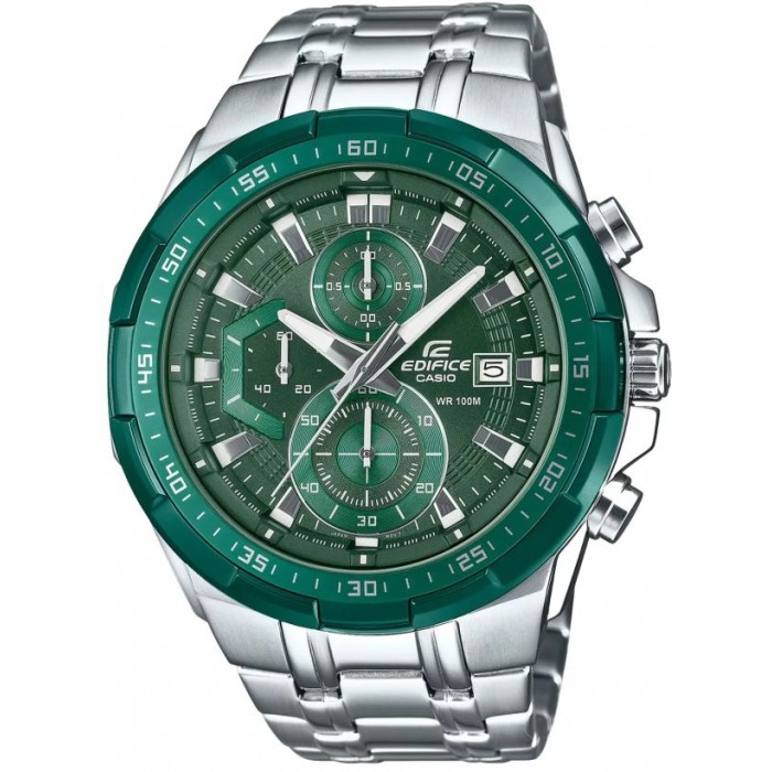 Zegarek Casio EFR-539DE-3AVUEF to dynamiczny, męski model z kolekcji Edifice, inspirowanej światem motoryzacji. Wyrafinowany chronograf w nowoczesnej stylistyce z zieloną tarczą, trzema sub-tarczami i bransoletą ze stali nierdzewnej. Idealny dla mężczyzn ceniących japońską precyzję, wytrzymałość i sportowy styl, doskonały na co dzień, do aktywności outdoorowych oraz biznesowych okazji.