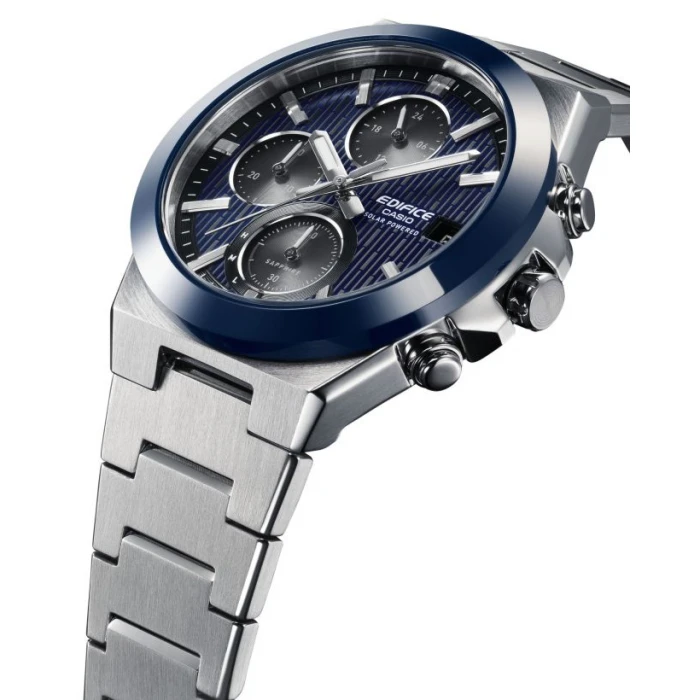 Zegarek męski CASIO EFS-S650D-2AEF wyposażony został w niezawodny mechanizm kwarcowy zasilany przez panel solarny, dzięki czemu nie wymaga wymiany baterii. Wskaźniki naładowania oznaczono na tarczy H, M, L. Koperta została wykonana z wysokiej jakości stali szlachetnej - odpornej na działanie czynników zewnętrznych takich jak woda czy pot a bezel pokryto powłoką ceramiczną. Stalowa bransoleta jest solidnie wykonana, zakończona zapięciem z przyciskami, które uniemożliwia odpięcie podczas użytkowania. Na cyferblacie umieszczono 3 małe tarcze - 2 z nich pełnią funkcję analogowego stopera w formie chronografu ( dokładność 1/1 sekundy do 30 minut ), trzecia wskazuje czas dobowy a datownik wskazujący dzień miesiąca umiejscowiono przy godzinie 3ej. Dodatkowo w zegarku zastosowano tzw. neobrite - czyli specjalną warstwę luminescencyjną na wskazówkach oraz indeksach, która po naświetleniu w dzień będzie podświetlać się w nocy. Tarcza nakryta została przez szkiełko szafirowe (9 punktów twardości w skali Mohsa) zapewniające ochronę przed zarysowaniami, optyczną przejrzystość (najlepszą wśród stosowanych szkiełek w zegarkach), jest bardzo trudne do zarysowania a także odporne na różnice temperatur i działanie rozpuszczalników. Do zalet zegarka CASIO EFS-S650D-2AEF możemy zaliczyć również wodoszczelność na poziomie 10ATM (100M), która pozwala na swobodne pływanie.