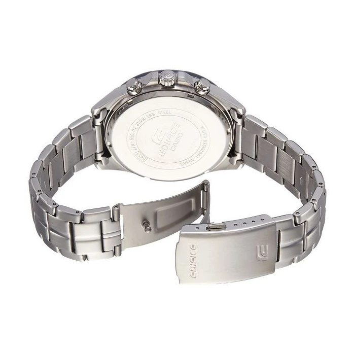 Zegarek Casio Edifice EFR-556DB-2AV jest oparty na niezawodnym, japońskim mechanizmie kwarcowym. Koperta czasomierza została wykonana z wysokiej jakości stali szlachetnej a następnie przykryta odpornym na stłuczenia szkiełkiem mineralnym. Całość została utrzymana na stalowej bransolecie. Wodoszczelność na poziomie 100m pozwala na swobodne pływanie. Na cyferblacie znajdują się chronografy wskazujące czas 24 godzinny - dobowy oraz stoper pozwalający odmierzać czas do 30 minut. Co więcej wskazówki jak i indeksy na tarczy zegarka zostały pokryte warstwą fosforyzującą, która po naświetleniu w dzień - delikatnie świecą się w ciemności.
