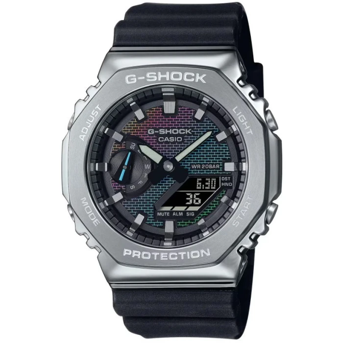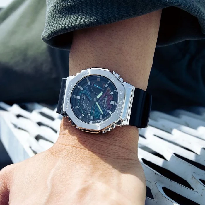 Zegarek GM-2100RW-1AER wyróżnia się kolorowym wzorem brick wall na tarczy. Tęczowe odcienie, uzyskane dzięki srebrnemu osadzaniu pary, laserowemu grawerowaniu i wielokolorowemu drukowi, zmieniają się w zależności od kąta padania światła, tworząc dynamiczny, futurystyczny efekt. Ośmiokątna koperta z polerowaną stalową ramką i smukły profil (11,8 mm) łączą elegancję z wytrzymałością. Analogowo-cyfrowy wyświetlacz z luminescencyjnymi wskazówkami zapewnia doskonałą czytelność, a czarny pasek z biożywicy dodaje komfortu i stylu.