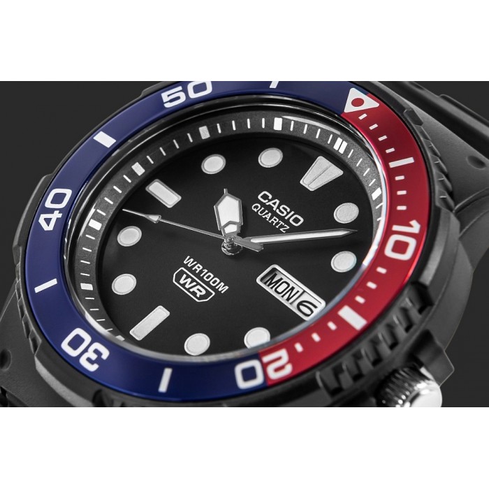 Zegarek męski CASIO  MRW-230H-1E2 zasilany jest mechanizmem kwarcowym. Czarna tarcza pokryta jest akrylowym szkiełkiem. Wodoszczelność na poziomie 10 ATM (100m) pozwala na swobodne pływanie. Czasomierz utrzymany jest na czarnym pasku z wytrzymałego i komfortowego w użytkowaniu tworzywa sztucznego. Wskazówki (godzinowa i minutowa) pokryte są warstwą neobrite co jest przydatne do odczytania aktualnej godziny po zmroku. Dodatkowym atutem modelu  MRW-230H-1E2 jest praktyczny datownik wskazujący aktualny dzień tygodnia i miesiąca. Modny wzór nurka z obrotowym bezelem.