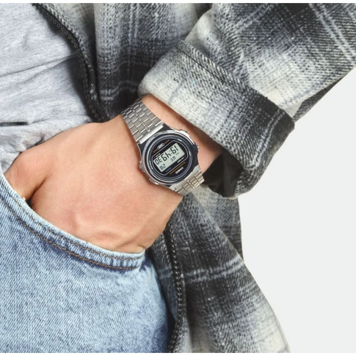 Zegarek CASIO A171WE-1AEF Unisex łączy sportowy charakter z oryginalnej wyglądem w retro stylu. Został wyposażony w mechanizm kwarcowy zasilany baterią. Srebrna, okrągła koperta czasomierza osadzona jest na stalowej bransolecie o najwyższym stopniu odporności na korozję. Tarczę zegarka zabezpiecza szkiełko hesalitowe. Atutem jest zapięcie suwakowe pozwalające na samodzielne dostosowanie długości bransolety do obwodu ręki.