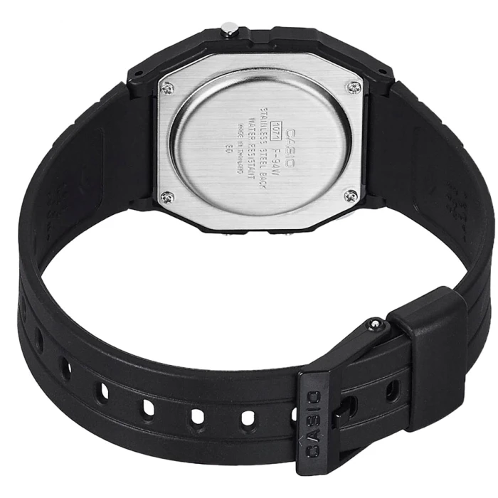 Wygodny pasek z tworzywa sztucznego w klasycznym czarnym kolorze zapewnia komfort noszenia przez cały dzień, a jego elastyczność sprawia, że zegarek doskonale dopasowuje się do nadgarstka. Konstrukcja zegarka została zaprojektowana z myślą o trwałości i wytrzymałości. Dzięki odporności na zachlapania, model F-94WA-8D świetnie sprawdza się w codziennym użytkowaniu, nie wymagając od Ciebie szczególnej ostrożności.