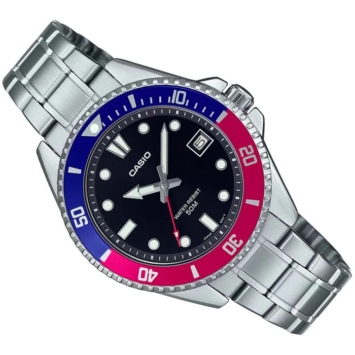 Zegarek MDV-10D-1A3 wyróżnia się kompaktową, stalową kopertą, która jest mniejsza niż w klasycznym modelu MDV-107, co czyni go idealnym dla osób z mniejszymi nadgarstkami lub preferujących subtelniejszy wygląd. Czarna tarcza z wyraźnymi, luminescencyjnymi wskazówkami i indeksami zapewnia doskonałą czytelność, a jednokierunkowa luneta dodaje sportowego charakteru. Stalowa bransoleta w srebrnym kolorze, wykonana ze stali nierdzewnej, nadaje zegarkowi elegancji i trwałości, idealnie komponując się z codziennymi i aktywnymi stylizacjami.