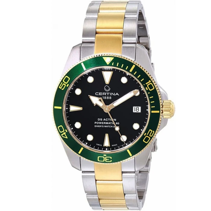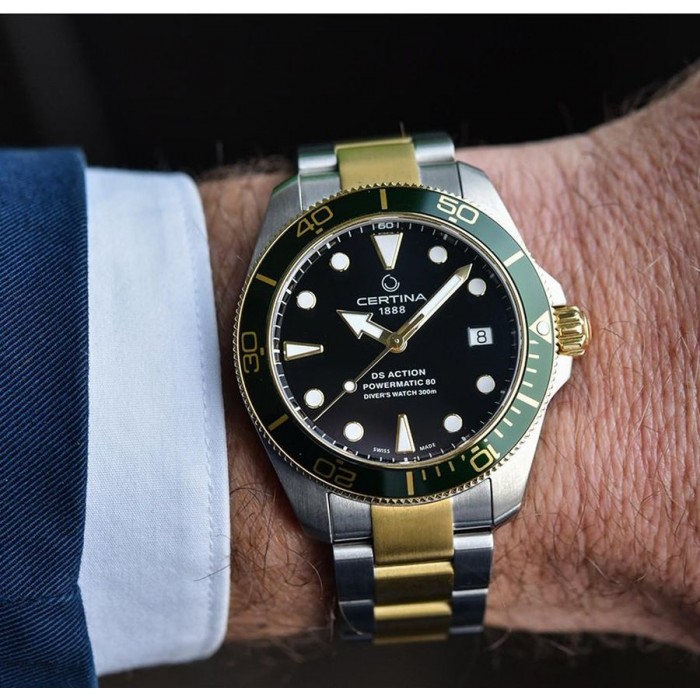 CERTINA C032.807.22.051.01 to zegarek typu diver posiadający certyfikat zgodny z normą ISO 6425, potwierdzający przystosowanie czasomierza do profesjonalnego nurkowania. Model napędzany jest za pomocą precyzyjnego mechanizmu automatycznego Powermatic 80.611 osadzony na 23 kamieniach łożyskujących, z rezerwą chodu aż 80 godzin! Srebrną kopertę z zielono złotym bezelem, wykonano z wysokiej jakości stali szlachetnej 316L, odpornej na warunki atmosferyczne oraz korozję, pokrytej powłoką w technologii PVD. Dopasowano tu trzyrzędową, dwutonową bransoletę z wygodnym przedłużeniem, aby można było spokojnie zapiąć zegarek na kombinezonie nurkowym. Zapięcie motylkowe, które zastosowano w modelu, pozwala na szybkie zakładanie i zdejmowanie czasomierza, a dodatkowe zabezpieczenie chroni przed jej samoistnym odpinaniem się. Tarcza w czarnym kolorze zabezpieczona została anty-refleksyjnym szkiełkiem szafirowym, najtwardszym dostępnym na rynku rodzajem szkła, co zapewnia odporność na zarysowania czy pęknięcia.