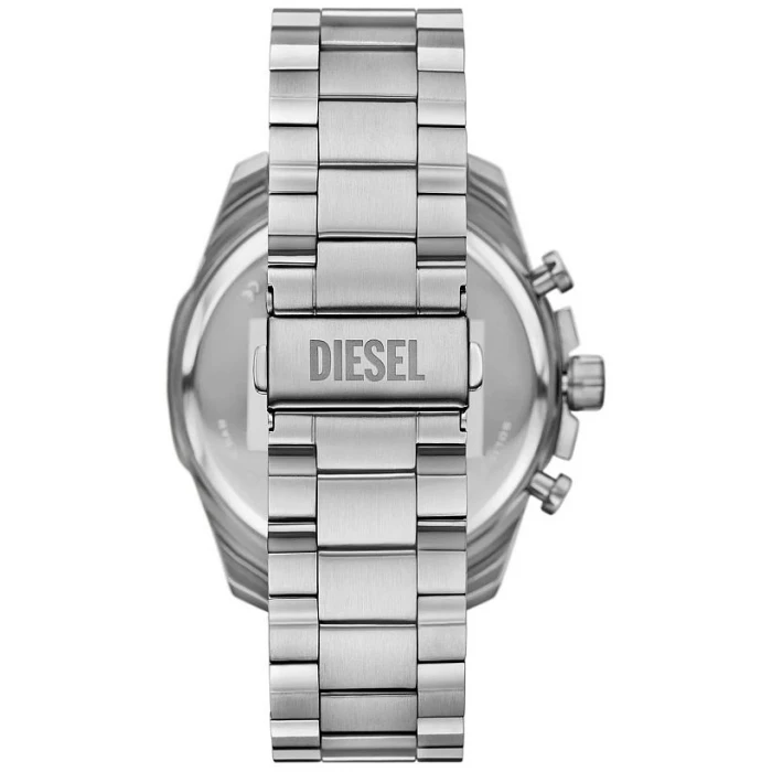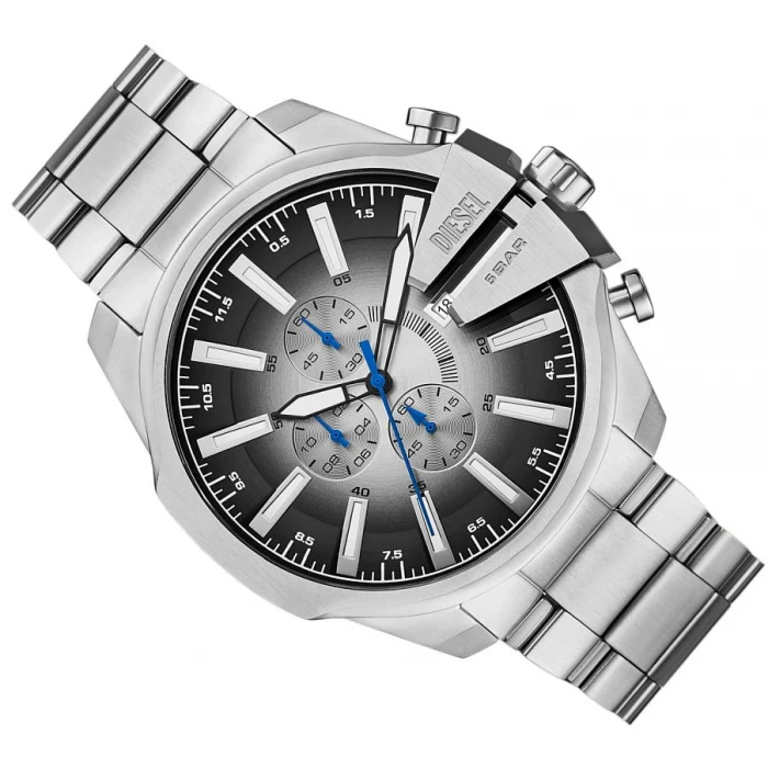 Diesel DZ4686 zachwyca masywnym, futurystycznym wyglądem. Szaro-srebrna tarcza z efektem sunray i luminescencyjnymi wskazówkami zapewnia doskonałą czytelność, a polerowana koperta ze stali nierdzewnej w srebrnym wykończeniu współgra z trzyrzędową bransoletą ze stali nierdzewnej z zapięciem zatrzaskowym z przyciskami. Waga i smukła, ale imponująca konstrukcja (wymiary 50 x 10mm) sprawiają, że zegarek wygodnie leży na nadgarstku, pasując do casualowych i streetwear stylizacji. Uwagę przykuwają subtarcze chronografu na godzinach 6, 9 i 12, dodające dynamicznego charakteru.