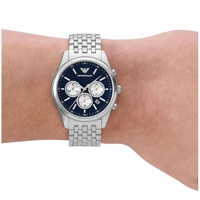 AR11582 posiada japoński mechanizm kwarcowy zasilany baterią. Zbudowany z chirurgicznej stali szlachetnej, która jest hipoalergiczna, trwała i odporna na działanie czynników zewnętrznych takich woda czy pot. Przykuwającą uwagę tarczę w niebieskim kolorze pokrywa odporne na stłuczenia szkiełko mineralne. Wodoszczelność na poziomie 3 atm to odporność na zachlapania np. podczas mycia rąk.