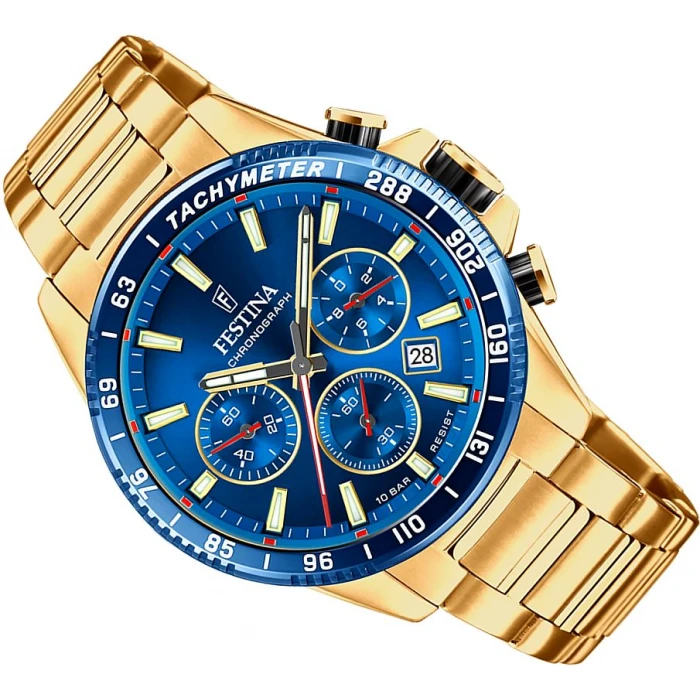 Festina F20634/3 z nowej kolekcji Timeless to zegarek męski na co dzień, do koszuli, ale także na basen. Wodoszczelny, ze skalą tachometru na lunecie koperty, stoperem i datownikiem oraz niebieską tarczą, której dodatkowo dynamiki dodają czerwone akcenty. Funkcjonalny ale i modny dodatek dla aktywnego mężczyzny.
