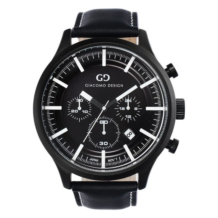 Zegarek męski Giacomo Design GD01001 napędzany jest za pomocą kwarcowego mechanizmu Seiko VR32. Czarna tarcza pokryta jest przez szkiełko mineralne, a wodoszczelność na poziomie 3 ATM sprawia, że czasomierz jest odporny na niewielkie zachlapania. Zegarek wyposażony jest w datownik, czas dobowy i chronograf. Stalowa koperta utrzymana jest na czarnym, skórzanym pasku.
