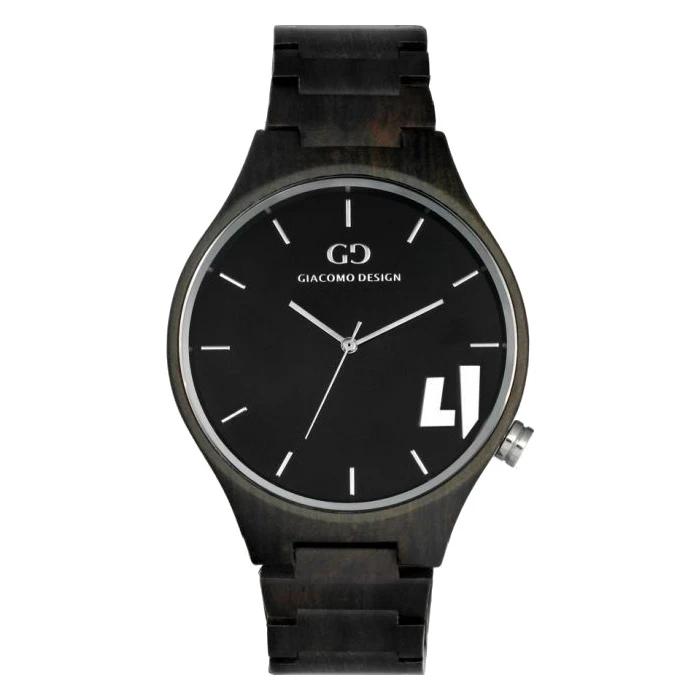 Zegarek męski Giacomo Design Coraggiosi GD08701 napędzany jest za pomocą mechanizmu kwarcowego. Bransoleta, koperta i tarcza wykonana jest z czarnego drewna sandałowego. Tarcza pokryta jest odpornym na stłuczenia szkiełkiem mineralnym.