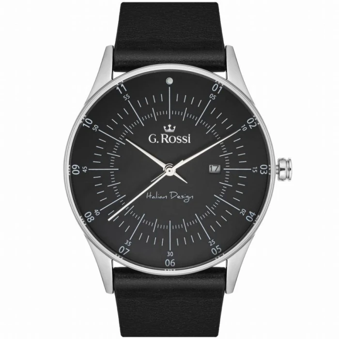 Model G.ROSSI G.R7028A4-1A1 wyposażono w tradycyjny mechanizm wskazówkowy, dzięki temu odczyt jest prosty i intuicyjny. Znaczniki godzin oraz wskazówki w kolorze srebrnym doskonale komponują się z ciemnym tłem, dając przejrzysty odczyt. Dodatkowo zegarek posiada wbudowany datownik wskazujący dzień miesiąca, co jest przydatne w codziennym użytkowaniu.