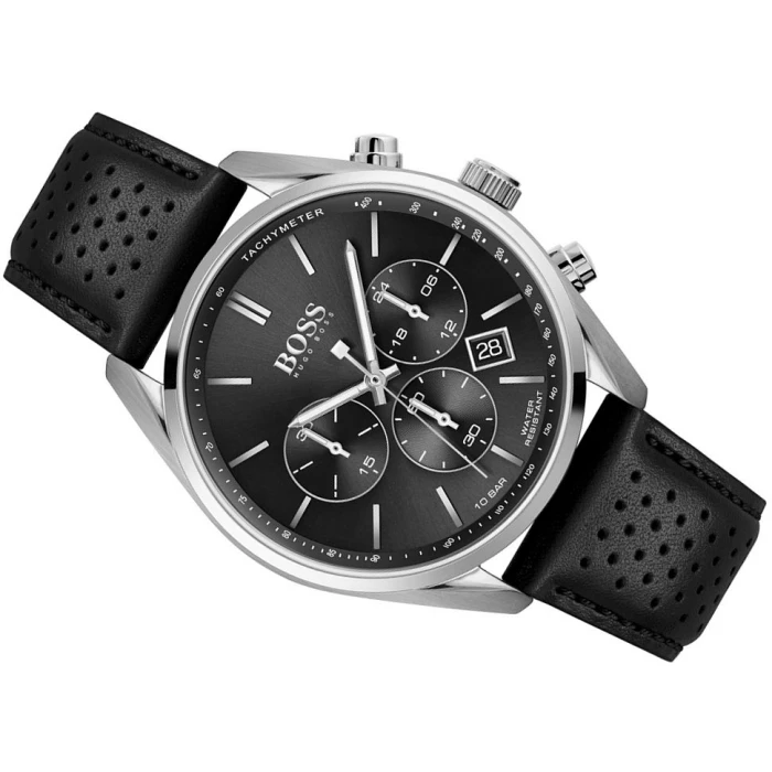 Elegancki zegarek męski Hugo Boss 1513816 posiada mechanizm kwarcowy zasilany baterią. Czarną tarczę pokrywa szkiełko mineralne. Do funkcji zegarka możemy zaliczyć stoper w formie chronografu, mierzący czas do 30 minut, czas dobowy oraz praktyczny datownik wskazujący aktualny dzień miesiąca.