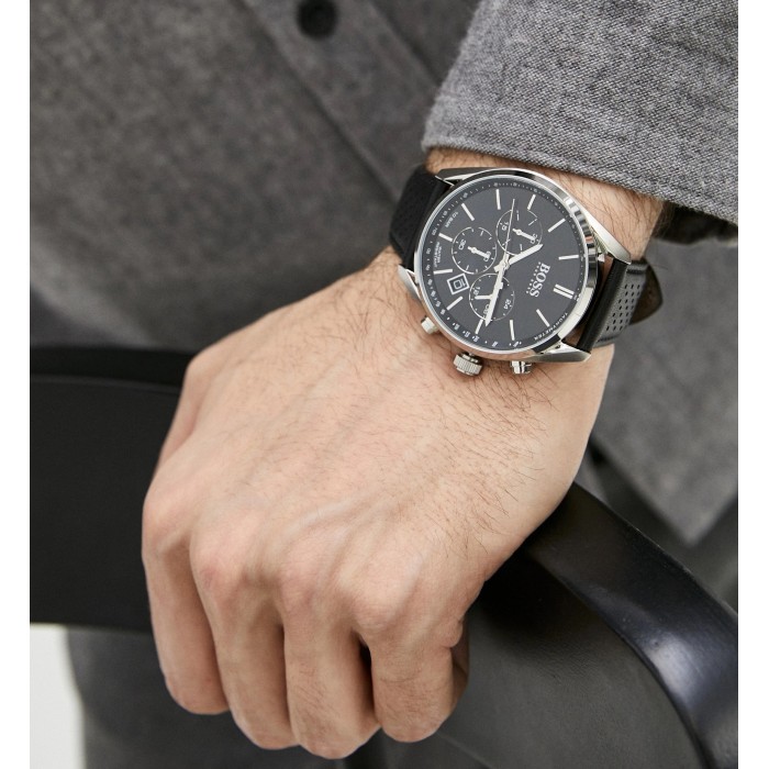 Model Hugo Boss 1513816 którego koperta wykonana została z wysokiej jakości stali szlachetnej 316l w srebrnym kolorze został zawieszony na czarnym, pikowanym pasku wykonanym z wysokogatunkowej skóry naturalnej. Wodoszczelność na poziomie 10 ATM (100m) pozwala na swobodne pływanie.