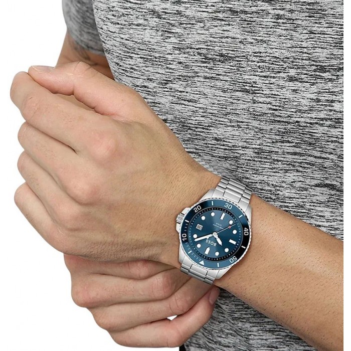 Model Hugo Boss 1513916, którego koperta wykonana została z wysokiej jakości stali szlachetnej 316l w srebrnym kolorze został zawieszony na srebrnej, stalowej bransolecie z zatrzaskowym zapięciem z przyciskami. Ogromną zaletą jest wodoszczelność na poziomie 20 ATM, co sprawia, że w zegarku można pływać oraz nurkować z akwalungiem.