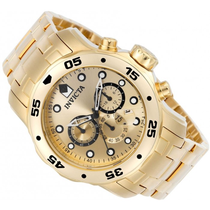 Zegarek męski INVICTA 0074 ze sportowej kolekcji SCUBA PRO DIVER. Modny chronograf w złotej kolorystyce o pokaźnym gabarytach - średnica koperty to 48mm. Tarczę wyróżnia datownik, którego czytelność zwiększa soczewka powiększająca. Jak przystało na prawdziwego nurka model ten jest w pełni wodoszczelny z zakręcaną koronką - WR200 - pozwala na swobodne pływanie i nurkowanie z zegarkiem na ręce. Kolejnym atutem jest obrotowy bezel, który pomaga w określeniu czasu spędzonego pod wodą i momentu dekompresji.
