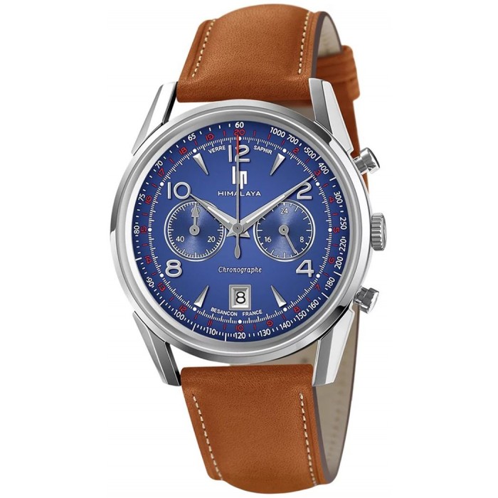 Zegarek LIP HIMALAYA 671597 to unikatowy model, który przypadnie do gustu mężczyznom z klasą. Ma on granatową tarczę z chronografem, tachometrem i datownikiem. Nad cyferblatem znajduje się szafirowe szkiełko, zapewniające skuteczną ochronę przed zarysowaniami. Koperta ze stali szlachetnej idealnie łączy się ze skórzanym paskiem w brązowym kolorze. Za niezawodne działanie produktu odpowiada wysokiej klasy mechanizm kwarcowy Miyota OS21. Wodoszczelność zegarka rozpoznawalnej marki LIP wynosi 5 ATM/50 metrów, co gwarantuje skuteczną ochronę przed lekkimi zachlapaniami.