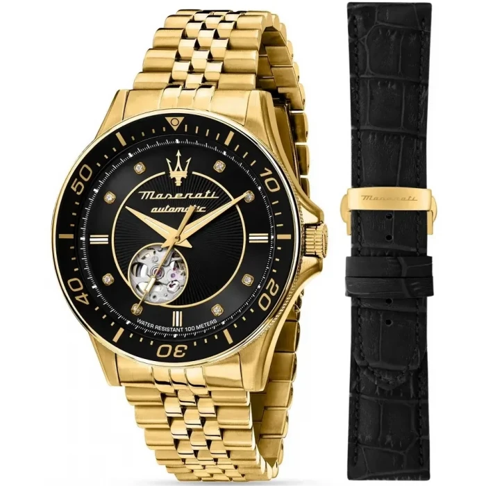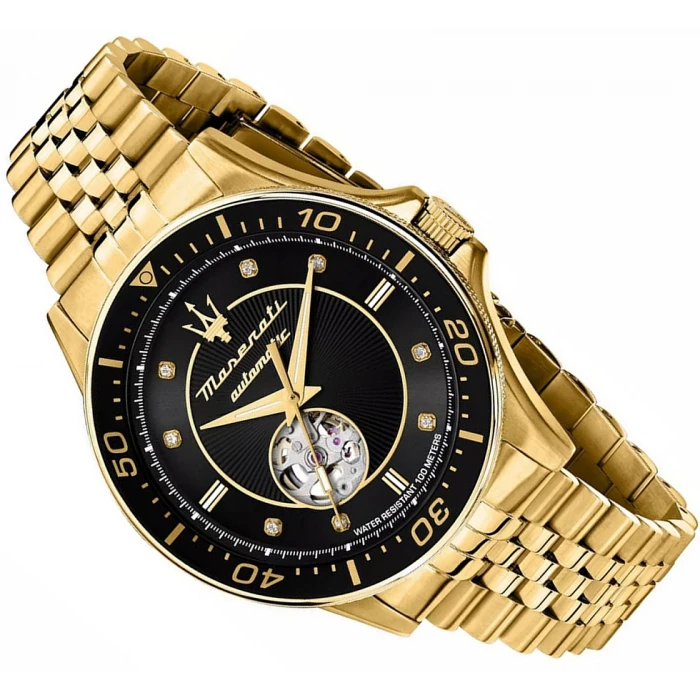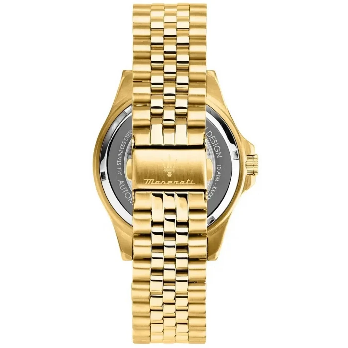 Model MASERATI R8823140012 to wyjątkowy i elegancki czasomierz włoskiej marki. Wyposażony w japoński mechanizm automatyczny osadzony na 24 kamieniach, gdzie rezerwa chodu wynosi 40 godzin. Koperta w złotym kolorze została wykonana z hipoalergicznej, odpornej na zarysowania oraz korozję stali szlachetnej, pokrytej powłoką w technologii PVD. Czasomierz zawieszono na stylowej bransolecie również w złotej barwie. Zapięcie motylkowe umożliwia szybkie zakładanie i zdejmowanie zegarka, przy czym konstrukcja nie pozwala na samoistne odpinanie bransolety. Tarcza w kolorze czarnym jest stanowczo tym elementem, na który warto zwrócić szczególną uwagę. Wykończona została dwoma rodzajami giloszu oraz prawdziwymi 8 diamentami w ramach indeksów godzinowych. Elegancji i klasy temu nietuzinkowemu czasomierzowi dodaje przeszklone okienko tzw. open heart, umożliwiające obserwowanie piękna pracy mechanizmu ukrytego w środku. Przykuwającym uwagę elementem jest charakterystyczna dla divera, luneta ze skalą na pierścieniu. W tym modelu pierścień jest giloszowany co podkreśla dbałość o każdy szczegół. Czasomierz zabezpieczono szkiełkiem szafirowym, które dzięki swojej twardości doskonale chroni cyferblat zegarka przed zarysowaniem.